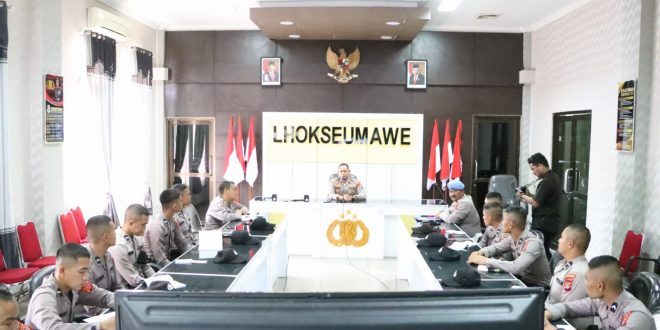 LHOKSEUMAWE – Kapolres Lhokseumawe, AKBP Henki Ismanto, SIK memberi arahan dan pembekalan kepada Bintara Remaja Polri, kegiatan ini berlangsung di Aula Vidcom Polres Lhokseumawe, Senin (29/8/2022).