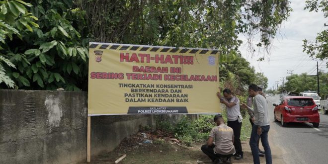 LHOKSEUMAWE – Personel Sat Lantas Polres Lhokseumawe memasang spanduk himbauan di sejumlah lokasi rawan terjadinya kecelakaan lalu lintas (blackspot) di wilayah hukum Polres Lhokseumawe, Jumat (19/8/2022).