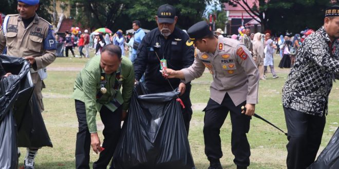 LHOKSEUMAWE – Usai acara karnaval dalam rangka memeriahkan HUT ke 77 Republik Indonesia, Kapolres Lhokseumawe, AKBP Henki Ismanto, SIK dan Penjabat Walikota Lhokseumawe, Dr. Drs Imran, MA kompak membersihkan sampah di Lapangan Hiraq, Kota Lhokseumawe, Kamis (18/8/2022).