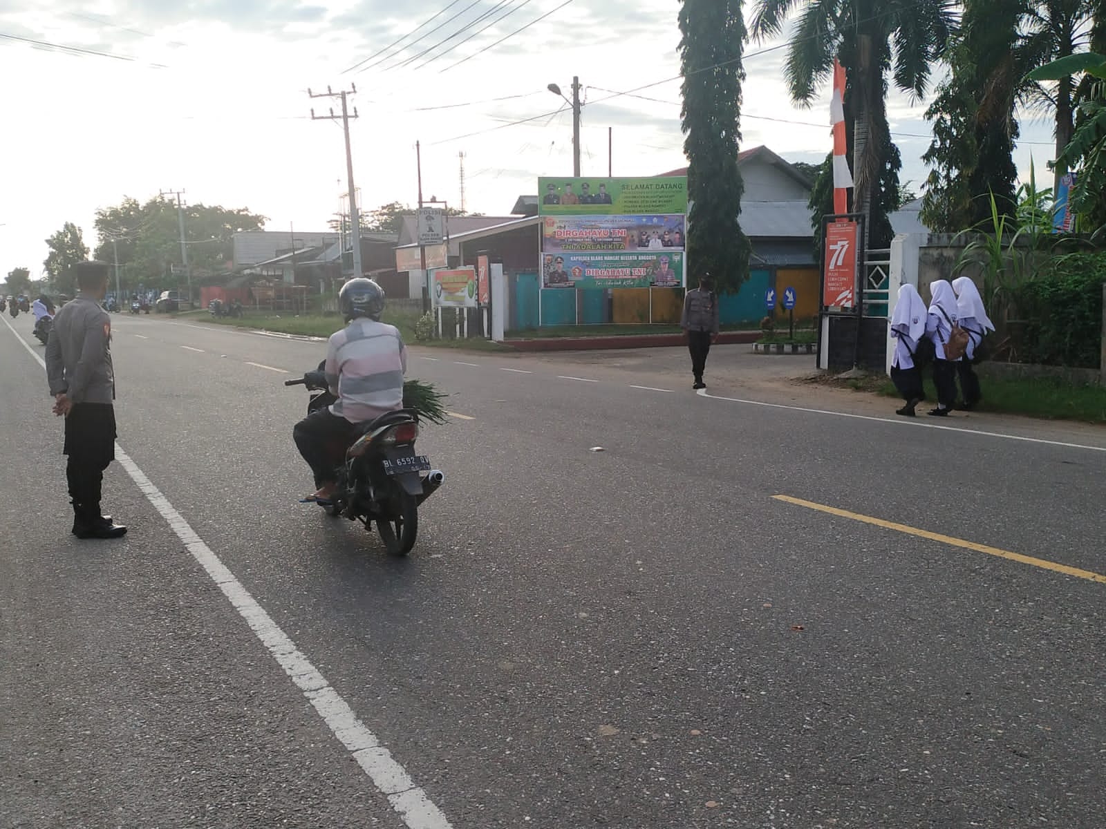LHOKSEUMAWE – Personel Polsek Blang Mangat melakukan pengaturan lalulintas dan melayani siswa menuju ke sekolah di jalan Medan – Banda Aceh, tepatnya di depan sekolah SMAN 6 dan SMPN 11 di Kecamatan Blang Mangat, Kota Lhokseumawe, Rabu (9/11/2022).