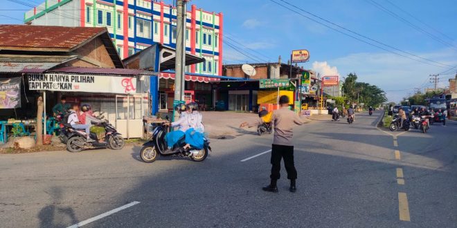 LHOKSEUMAWE – Personel Polsek Muara Dua melakukan pengaturan lalulintas di Simpang Jalan Elak, Desa Alue Awe, Kecamatan Muara Dua, Kota Lhokseumawe, Selasa (8/11/2022).