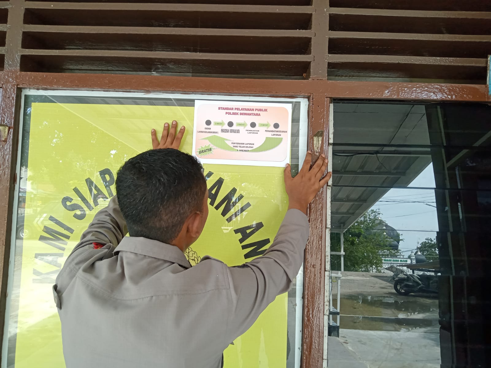LHOKSEUMAWE – Personel menempelkan brosur alur standar pelayanan publik Mako Polsek Dewantara, penempelan brosur ini dilaksanakan di tempat umum di Kecamatan Dewantara, Aceh Utara, wilayah hukum Polres Lhokseumawe, Sabtu (6/11/2022).