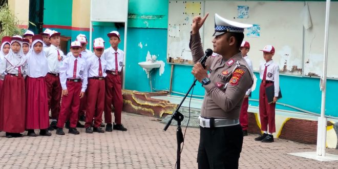 LHOKSEUMAWE – Personel Satlantas Polres Lhokseumawe menjadi inspektur upacara di SDN 1 Muara Dua, dalam kegiatan ini personel mengedukasi tertib berlalulintas kepada murid sekolah tersebut, Senin (7/11/2022).