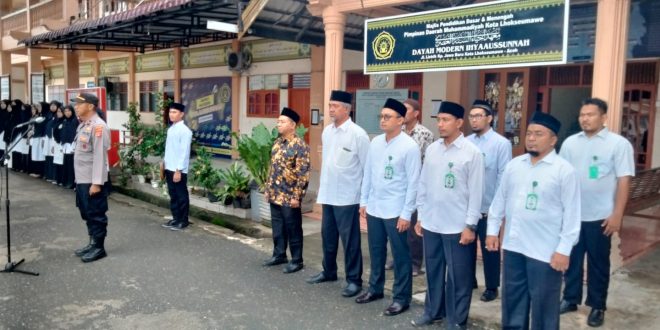 LHOKSEUMAWE – Kapolsek Banda Sakti diwakili Wakapolsek, Ipda Yudira Nugraha memberi pengarahan kepada santri Dayah Modern Ihyaaussunnah Kampung Jawa, Kecamatan Banda Sakti, Kota Lhokseumawe, Senin (7/11/2022).