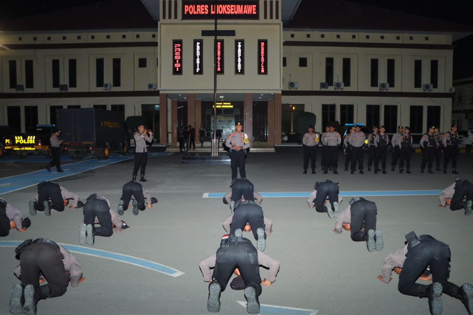 LHOKSEUMAWE – Sebanyak 25 personel Bintara Remaja penempatan tugas awal di Polres Lhokseumawe melakukan sujud syukur saat tiba di Mapolres Lhokseumawe, Rabu (31/1/2024) malam.