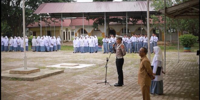 LHOKSEUMAWE, Kanit Registrasi dan Identifikasi (Regindent) Sat Lantas Polres Lhokseumawe Polda Aceh menjadi pembina upacara bendera di SMA Negeri 7 Kota Lhokseumawe hari ini. Kegiatan ini merupakan bagian dari program Saweu Sikula dan penyuluhan mengenai Kamseltibcar (Keamanan, Keselamatan, Ketertiban, dan Kelancaran) Lalu Lintas.Kamis 01/07/2024 pagi.