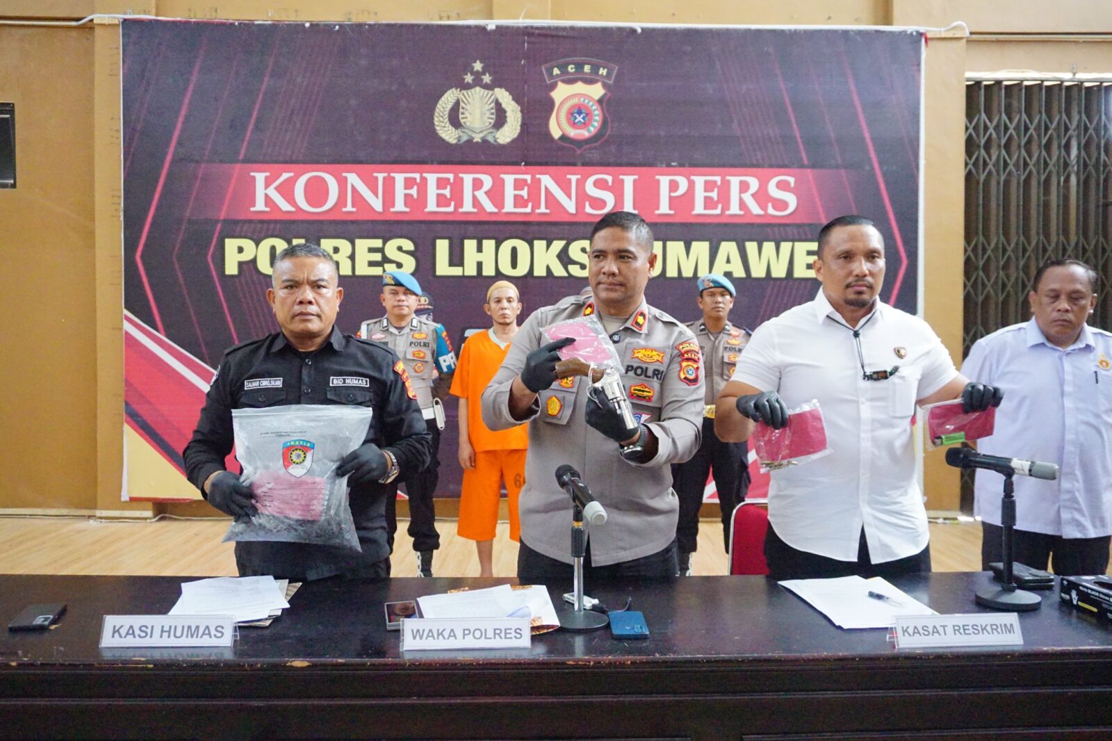 Kasus tersebut diungkap dalam konfrensi pers yang dipimpin Kapolres Lhokseumawe AKBP Dr. Ahzan., S.H., S.I.K., M.S.M., M.H diwakili Wakapolres Lhokseumawe Kompol Salmidin., S.E., MM didampingi Kasat Reskrim IPTU Yudha Prasatya, S.H dan Kasi Humas Salman Alfarasi, S.H., M.M serta dihadiri sejumlah awak insan pers di Gedung serbaguna Polres Lhokseumawe, rabu siang (30/7/2025).