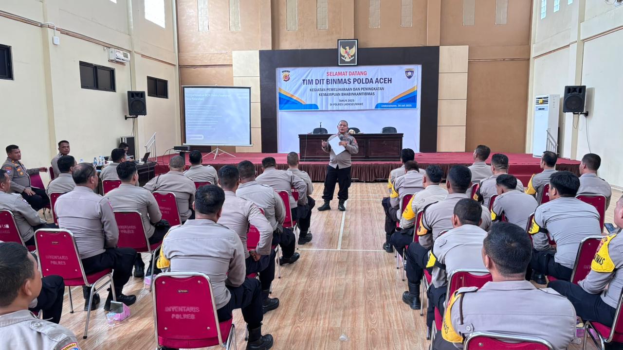 Lhokseumawe — Dalam rangka meningkatkan profesionalisme dan kualitas pelayanan kepolisian kepada masyarakat, Tim Direktorat Binmas (Ditbinmas) Polda Aceh melaksanakan kegiatan Pemeliharaan dan Peningkatan Kemampuan Bhabinkamtibmas tahun 2025 di Aula Wira Satya Polres Lhokseumawe, Rabu (30/7/2025) siang.