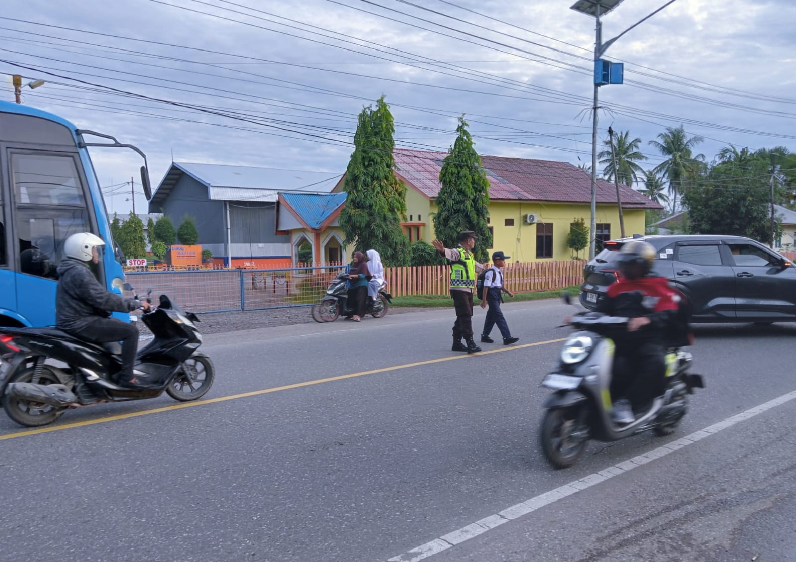 Lhokseumawe – Personel Polsek Blang Mangat melaksanakan kegiatan strong point berupa pengamanan dan pengaturan arus lalu lintas di Jalan Raya Medan–Banda Aceh, tepatnya di Desa Ule Blang Mane, Kecamatan Blang Mangat, Kota Lhokseumawe, Selasa (5/8/2025) pagi.