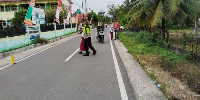 Aceh Utara – Kepedulian terhadap keselamatan pelajar diwujudkan personel Polsek Syamtalira Bayu, saat melaksanakan giat Strong Point pengamanan dan pengaturan arus lalu lintas di Jalan Raya Medan–Banda Aceh, tepatnya di Simpang Cot Plieng, Kecamatan Syamtalira Bayu, Kabupaten Aceh Utara, Senin (11/8/2025) pagi.