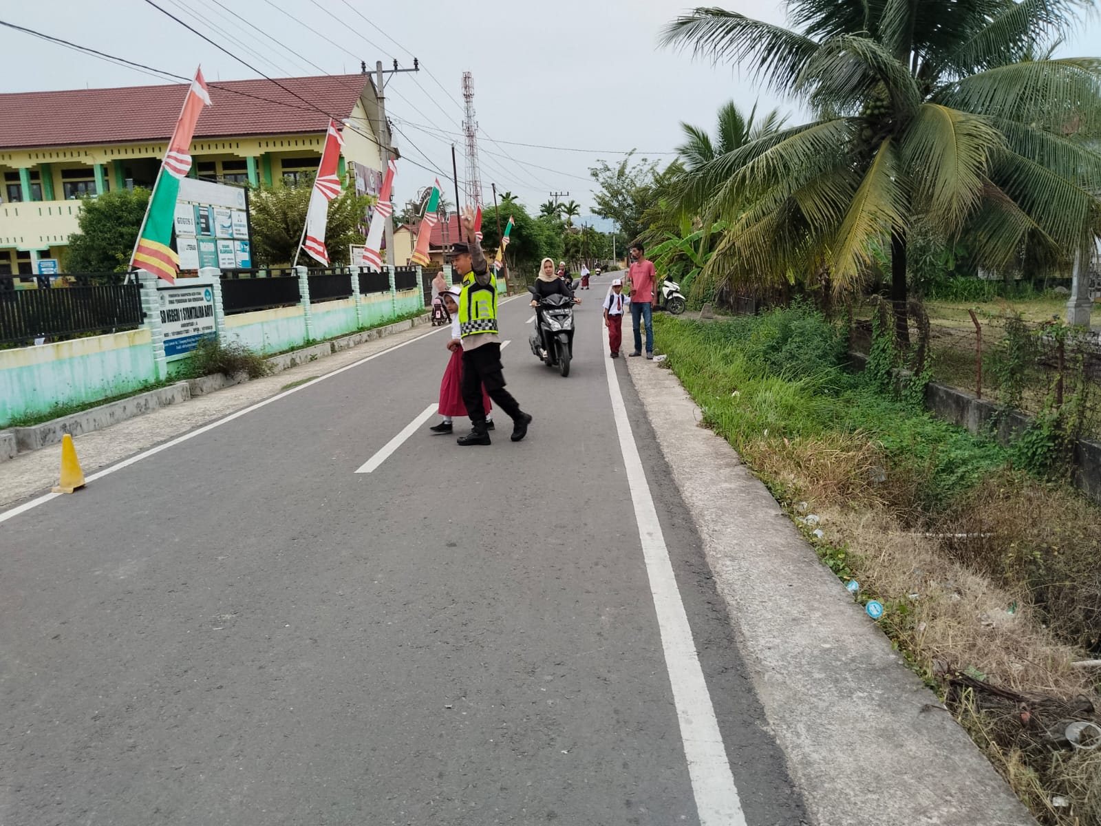 Aceh Utara – Kepedulian terhadap keselamatan pelajar diwujudkan personel Polsek Syamtalira Bayu, saat melaksanakan giat Strong Point pengamanan dan pengaturan arus lalu lintas di Jalan Raya Medan–Banda Aceh, tepatnya di Simpang Cot Plieng, Kecamatan Syamtalira Bayu, Kabupaten Aceh Utara, Senin (11/8/2025) pagi.
