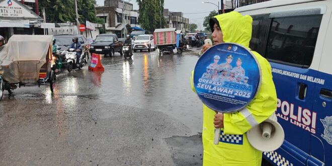 Petugas Polantas tampak menyampaikan imbauan kepada masyarakat pengguna jalan mengenai pentingnya tertib berlalu lintas. Meskipun diguyur hujan, para personel tetap berdiri di tepi jalan, menyapa para pengendara dan memberikan edukasi tentang keselamatan berkendara.
