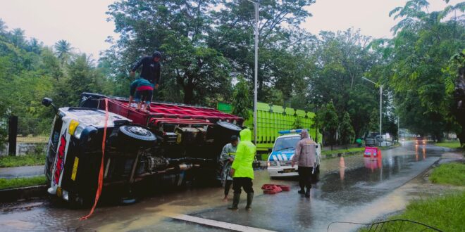 LHOKSEUMAWE – Satu unit truk enam roda (KR 6) terbalik di ruas Jalan Medan–Banda Aceh, tepatnya di depan PJB Desa Meuria Paloh, Kecamatan Muara Satu, Lhokseumawe, sekitar pukul 09.00 WIB, Selasa pagi (25/11/2025). Kondisi hujan deras, jalan licin, serta adanya lubang besar di badan jalan diduga menjadi penyebab kecelakaan tunggal tersebut. Personel Polres Lhokseumawe melalui Polsek Muara Satu bergerak cepat menuju lokasi untuk melakukan penanganan dan pengamanan arus lalu lintas.