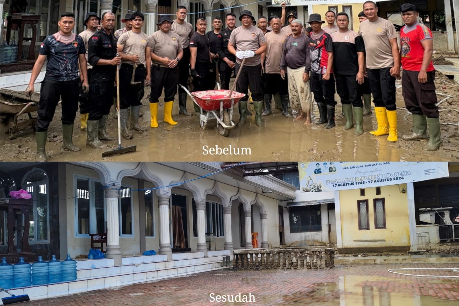 Aceh Utara – Meunasah Blang Peuria, Kec. Samudera, Kab. Aceh Utara, Provibsi Aceh yang sebelumnya dipenuhi lumpur akibat banjir kini kembali bersih dan layak digunakan oleh masyarakat. Perubahan tersebut merupakan hasil kerja bakti personel Polres Lhokseumawe yang dilaksanakan sejak Kamis dan berlanjut hingga Jumat pagi (19/12/2025) sekitar pukul 11.30 WIB.