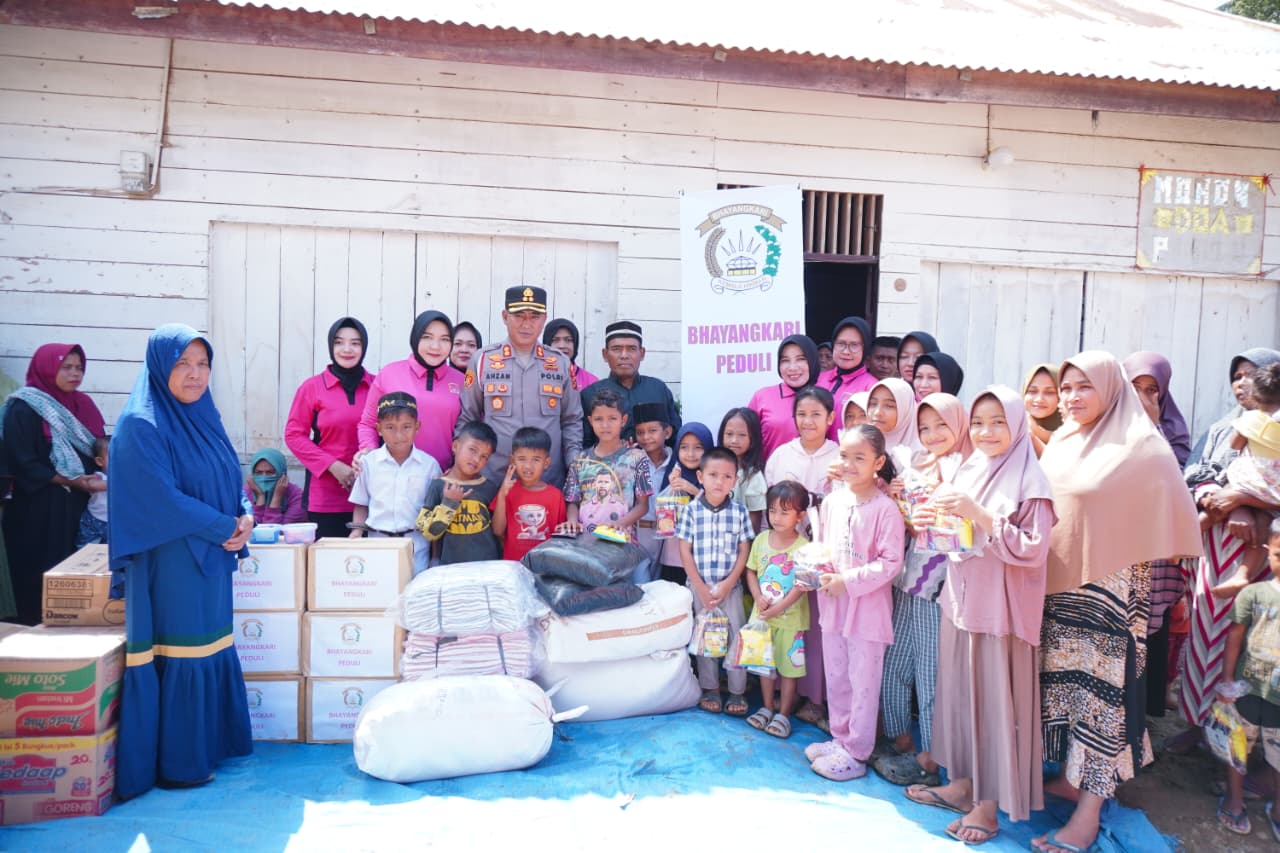 ACEH UTARA – Kapolres Lhokseumawe AKBP Dr. Ahzan, S.H., S.I.K., M.S.M., M.H. dan Ketua Bhayangkari Lhokseumawe Ny. Ita Ahzan kembali menyerahkan bantuan sembako untuk masyarakat di dua desa dalam Kecamatan Nisam, Kabupaten Aceh Utara, yang beberapa hari terakhir dilanda banjir dan lonsor, Selasa (9/12/2025) sekira pukul 11.00 WIB.