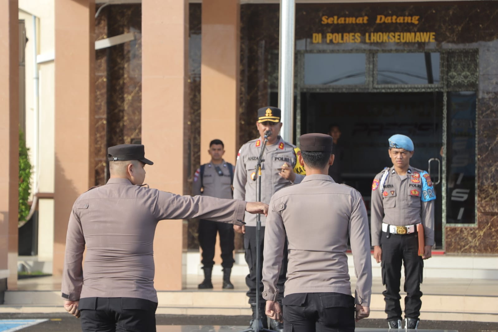 Lhokseumawe — Kapolres Lhokseumawe AKBP Dr. Ahzan, S.I.K., M.S.M., M.H., memberikan arahan sekaligus motivasi kepada seluruh personel saat memimpin apel pagi di halaman Mapolres Lhokseumawe, Senin (29/12/2025).