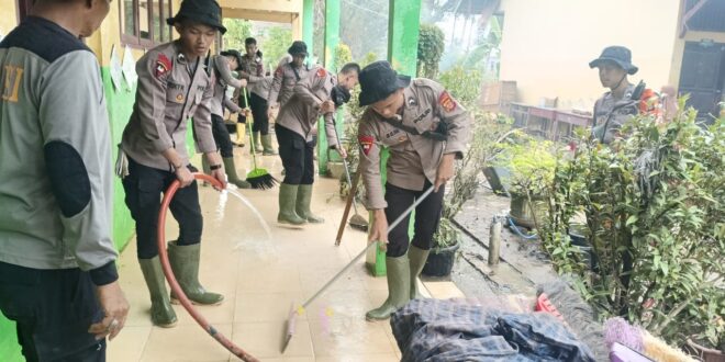 Lhokseumawe — Personel Polres Lhokseumawe bersama personel Brimob melaksanakan kegiatan pembersihan lingkungan Sekolah Dasar (SD) Negeri 12 Dewantara, Kabupaten Aceh Utara, sebagai bagian dari upaya pemulihan pascabencana banjir, Minggu (28/12/2025).