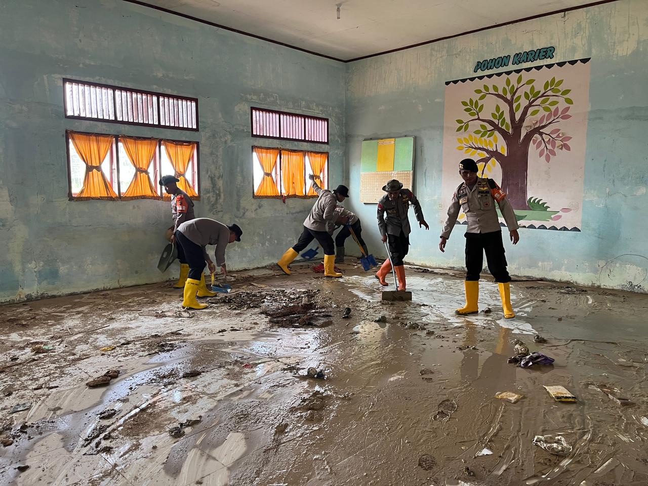 Kegiatan yang dimulai sekitar pukul 10.00 WIB tersebut dilakukan sebagai bentuk kepedulian Polri terhadap dunia pendidikan agar aktivitas belajar mengajar dapat kembali berjalan normal setelah banjir merendam lingkungan sekolah.