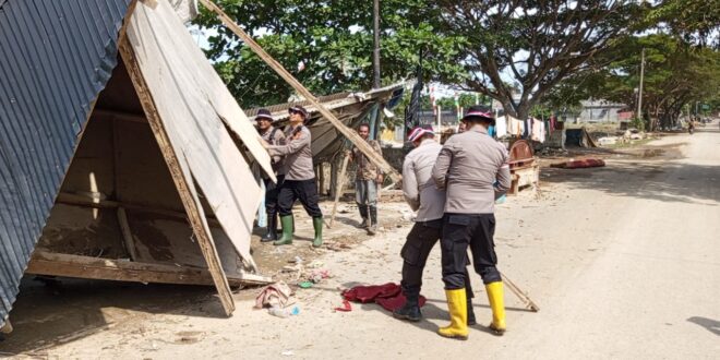 Lhokseumawe – Polres Lhokseumawe melakukan aksi cepat dengan membersihkan puing-puing kayu serta material sisa banjir yang menumpuk di sepanjang Jalan Malikussaleh, Aceh Utara, Sabtu (06/12/2025) sekitar pukul 10.00 WIB. Langkah ini dilakukan untuk memastikan akses utama menuju Bandara Malikussaleh kembali normal dan aman dilalui masyarakat.