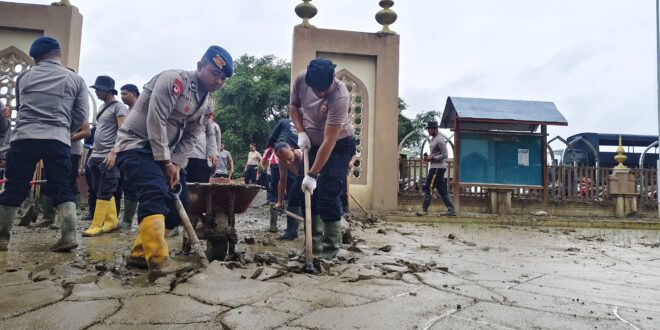 Aceh Utara — Kepedulian terhadap warisan sejarah kembali ditunjukkan Polres Lhokseumawe bersama personel Brimob Batalyon B Jeulekat. Puluhan personel gabungan dikerahkan untuk membersihkan Museum Islam Samudera Pasai yang terdampak banjir, Sabtu pagi (20/12/2025).