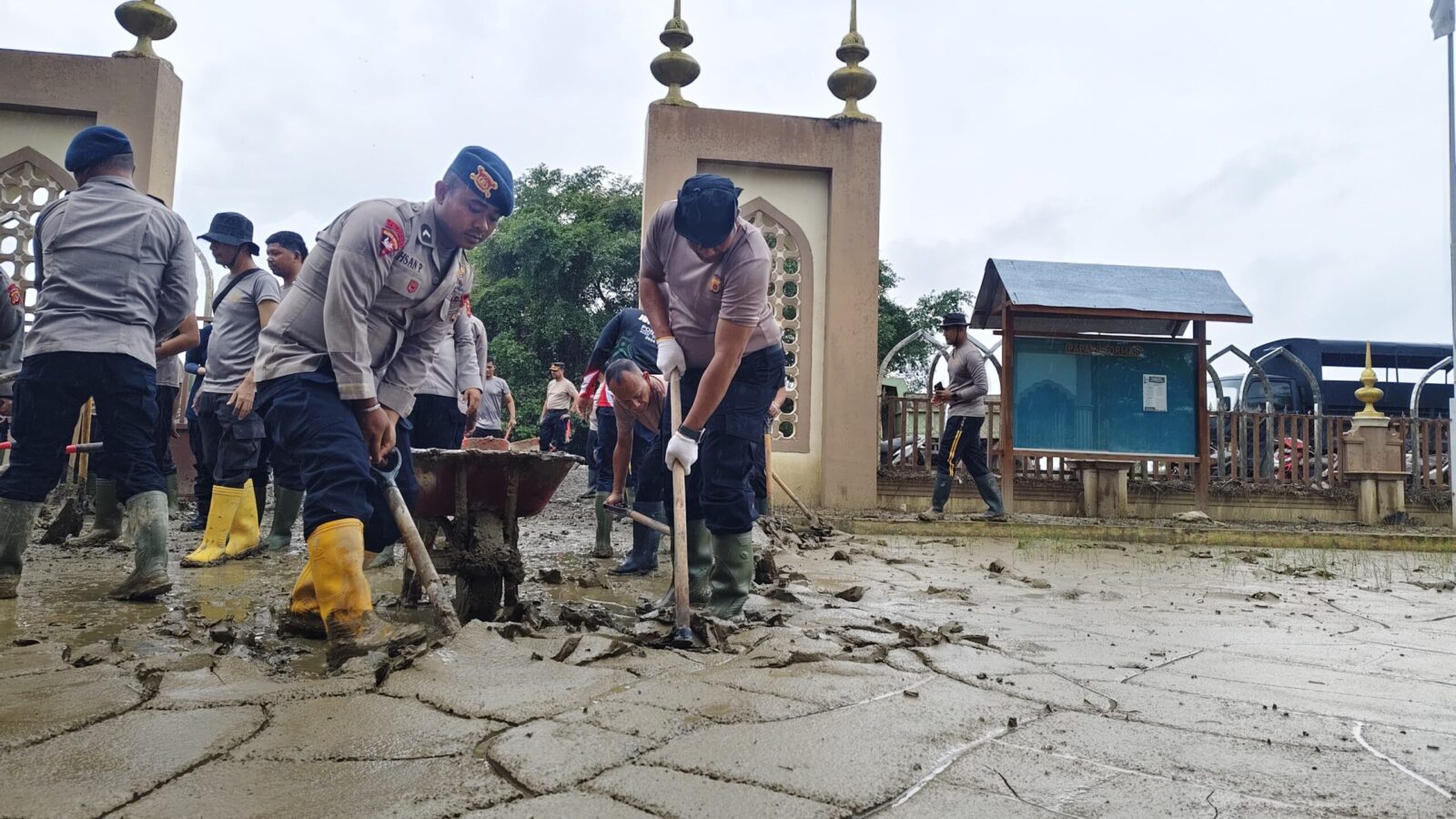 Museum bersejarah yang terletak di Desa Beuringen, Kecamatan Samudera, Kabupaten Aceh Utara itu sempat terendam banjir, menyisakan lumpur tebal di sejumlah ruangan. Sejak pagi hari, personel Polres Lhokseumawe dan Brimob tampak bahu-membahu membersihkan area museum menggunakan cangkul dan angkong untuk mengangkat lumpur.