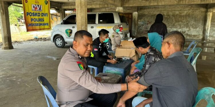 Aceh Utara — Polres Lhokseumawe melalui Klinik Pratama melaksanakan kegiatan bakti kesehatan berupa pelayanan dan pengobatan gratis bagi masyarakat yang mengungsi akibat bencana banjir di Posko Desa Lagang, Kecamatan Sawang, Kabupaten Aceh Utara, Senin (22/12/2025).