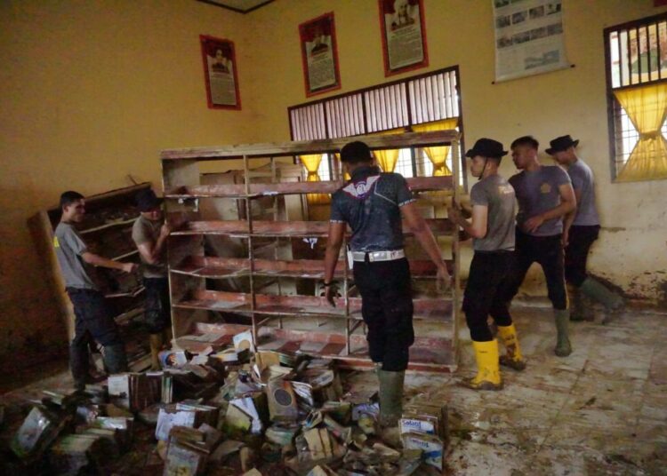 Sejak pukul 09.00 WIB, personel Polres Lhokseumawe bersama personel Polsek Muara Batu dan Brimob Kompi I Yon B Jeulikat bahu-membahu membersihkan lumpur yang menutupi ruang kelas, ruang dewan guru, lorong sekolah, serta halaman sekolah akibat banjir.