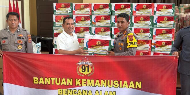Lhokseumawe – Wali Kota Lhokseumawe, Dr. Sayuti Abu Bakar, S.H., M.H., menyampaikan apresiasi mendalam kepada Polri, khususnya Alumni Akpol 91 beserta istri, atas bantuan kemanusiaan yang diberikan untuk warga terdampak banjir. Ucapan tersebut disampaikan saat menerima paket bantuan secara simbolis dari Kapolres Lhokseumawe AKBP Dr. Ahzan, S.H., S.I.K., M.S.M., M.H. di Gedung Serbaguna Polres Lhokseumawe, Sabtu pagi (6/12/2025).