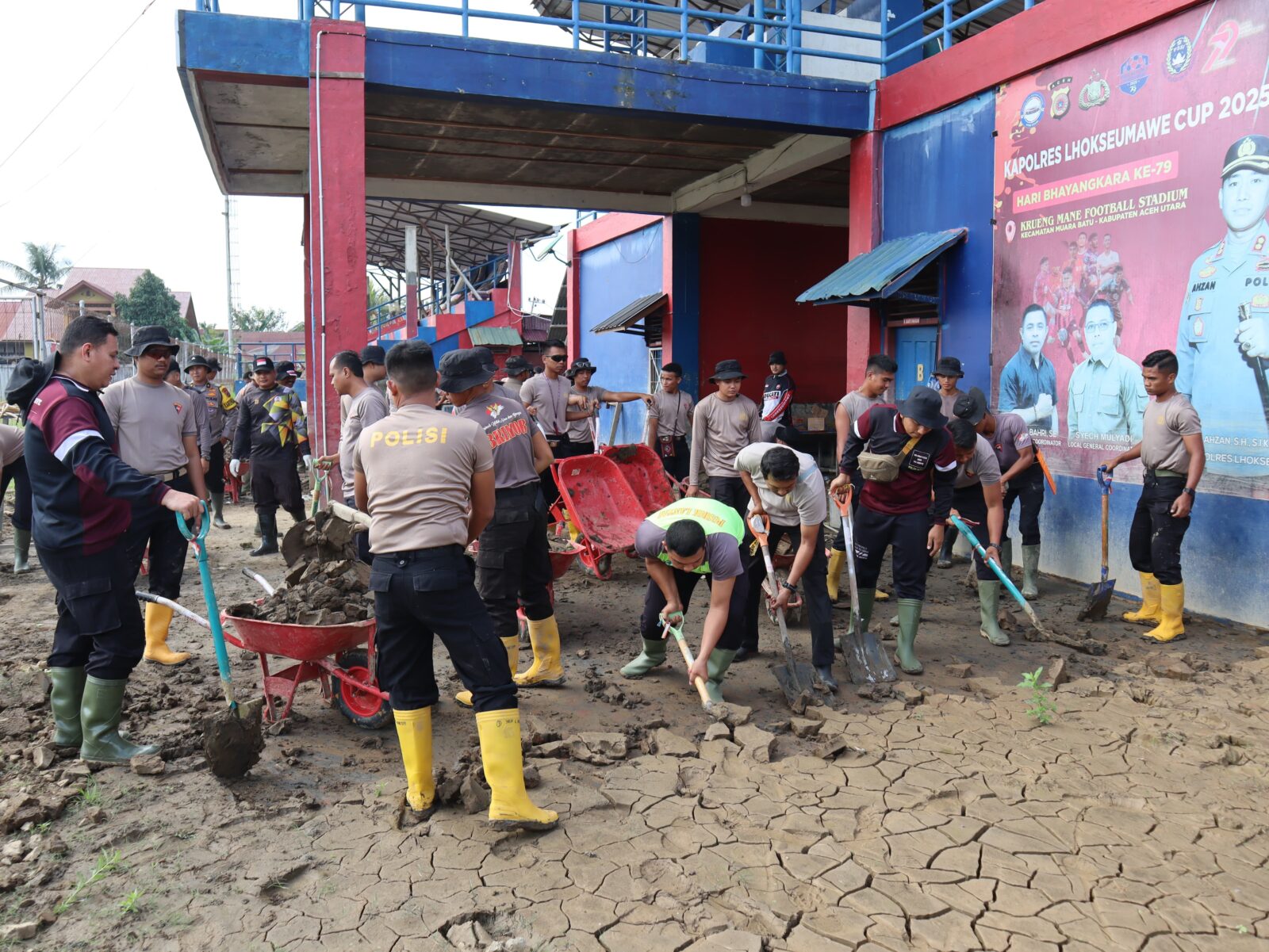 Rangkaian kegiatan pembersihan ini diawali dengan pelaksanaan apel gabungan yang dipimpin oleh Kabagren Polres Lhokseumawe, Kompol Anwar, S.H., bertempat di lapangan apel Mapolres Lhokseumawe. Setelah menerima arahan terkait pembagian tugas, seluruh personel segera melakukan pergeseran pasukan (Serpas) menuju ploting wilayah pembersihan di area stadion. Di lokasi, personel Brimob Kaltim bersama unsur terkait bahu-membahu menyisir tribun, area ruang ganti, hingga lintasan lari yang tertutup material lumpur tebal, menunjukkan sinergitas yang kuat dalam menanggulangi dampak bencana alam di wilayah tersebut.