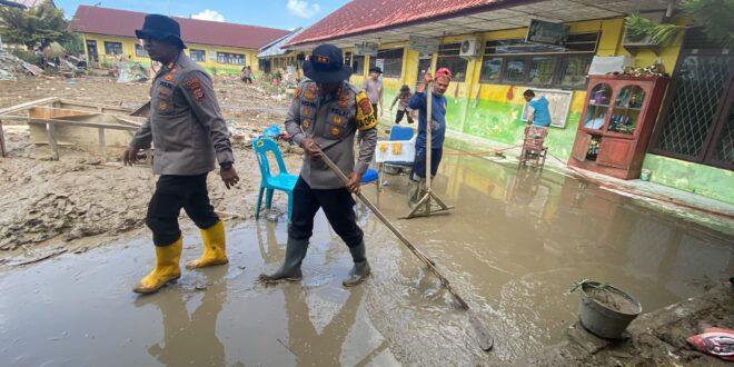 Puluhan personel dikerahkan. Water canon, mobil tangki air, dan dam truk bekerja silih berganti. Lumpur yang sempat menutup lorong dan ruang kelas perlahan tersingkir. Papan tulis kembali terlihat putih, lantai kembali mengering, dan halaman sekolah mulai bersih.