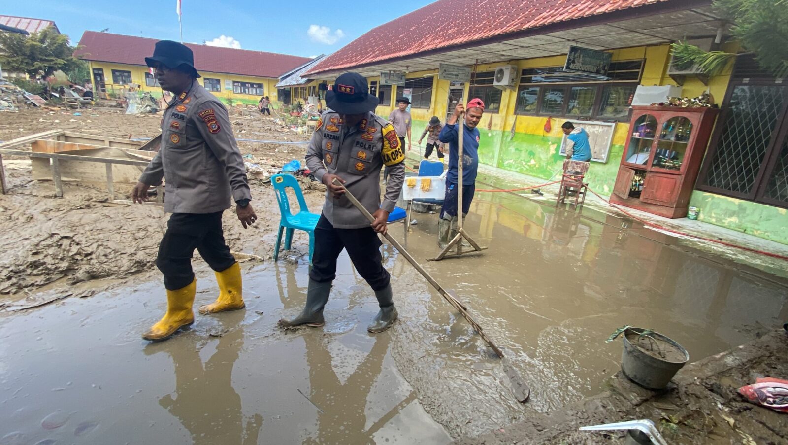 Puluhan personel dikerahkan. Water canon, mobil tangki air, dan dam truk bekerja silih berganti. Lumpur yang sempat menutup lorong dan ruang kelas perlahan tersingkir. Papan tulis kembali terlihat putih, lantai kembali mengering, dan halaman sekolah mulai bersih.