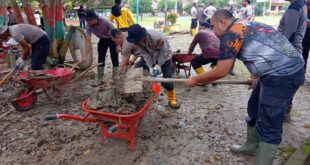 Sementara itu, personel Polres Lhokseumawe bersama BKO Brimobda Kaltim tampak bahu-membahu membersihkan endapan lumpur di dalam dan sekitar Masjid Syuhada. Upaya tersebut dilakukan agar masjid kembali bersih dan dapat segera digunakan masyarakat untuk melaksanakan ibadah.