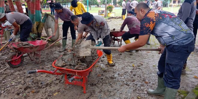 ACEH UTARA – Wujud kepedulian Polri terhadap dunia pendidikan pascabencana banjir bandang kembali ditunjukkan oleh Polres Lhokseumawe bersama Polsek Samudera dan BKO Brimobda Kaltim. Puluhan personel dikerahkan untuk melaksanakan kegiatan pembersihan SMA Negeri 1 Samudera di Desa Blang Peuria, Kecamatan Samudera, Kabupaten Aceh Utara, Provinsi Aceh, Jumat (9/1/2026).
