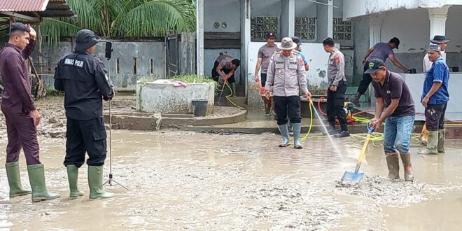 ACEH UTARA – Personel Polres Lhokseumawe bersama BKO Brimobda Kaltim melaksanakan kegiatan gotong royong pembersihan rumah ibadah yang terdampak banjir di Masjid Syuhada, Desa Madan, Kecamatan Samudera, Kabupaten Aceh Utara, Jumat (2/1/2026) pagi.