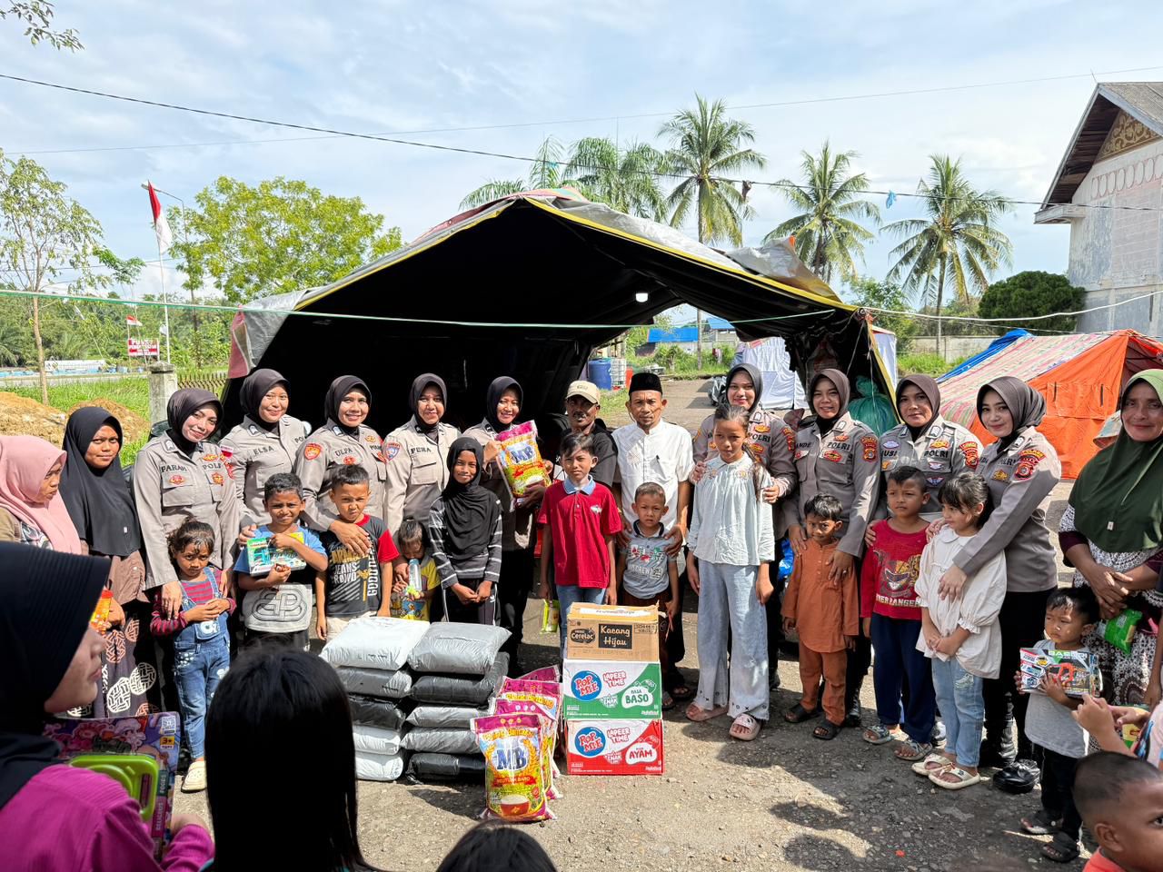 Selain penyerahan bantuan, Polwan Polres Lhokseumawe juga menggelar kegiatan trauma healing dengan mengajak anak-anak bermain dan belajar bersama. Kegiatan tersebut dipandu oleh Polwan senior yang mewakili Kabag SDM Polres Lhokseumawe, sehingga suasana posko tampak lebih ceria dan penuh kehangatan.