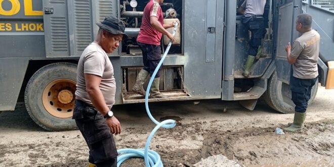 LHOKSEUMAWE – Polres Lhokseumawe mengerahkan kendaraan taktis water canon sebagai andalan untuk membersihkan sekolah dan masjid yang terdampak lumpur pascabanjir di sejumlah wilayah hukum Polres Lhokseumawe.