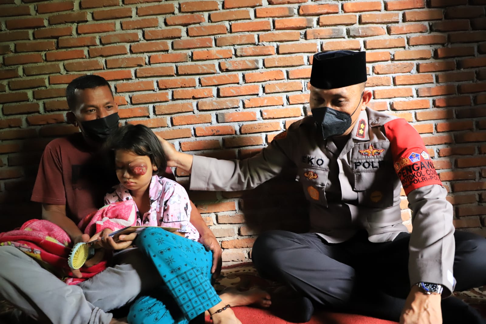 LHOKSEUMAWE - Kapolres Lhokseumawe, AKBP Eko Hartanto, SIk, MH mengunjungi kediaman bocah penderita kanker mata di Dusun Cot Lha, Desa…