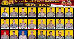 LHOKSEUMAWE – Polres Lhokseumawe kembali memajang foto personel terbaik untuk Triwulan III tahun 2021 di ruang lobi gedung Mapolres Lhokseumawe. Kapolres Lhokseumawe AKBP Eko Hartanto SIK MH melalui Kasubag Humas Salman Alfarisi SH MH, Senin (11/10/2021) mengatakan, pemajangan foto personel terbaik tersebut untuk memotivasi anggota lain supaya terus berkarya dan …