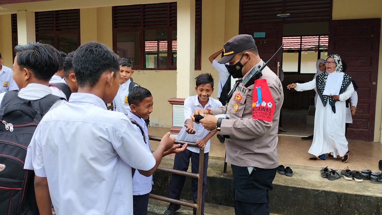 LHOKSEUMAWE - Kapolsek Simpang Keuramat, Ipda Faisal, SH melakukan sosialisasi vaksin dan membagikan masker kepada para pelajar di SMP Negeri…