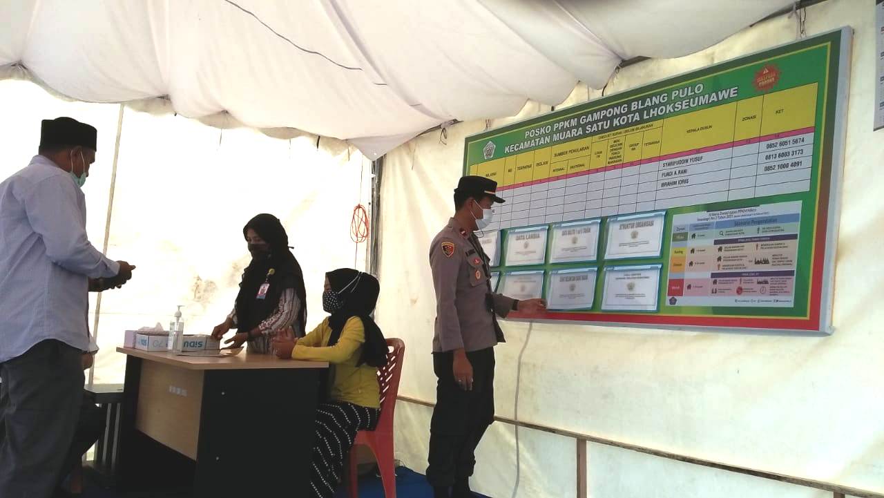 LHOKSEUMAWE - Personel Polres Lhokseumawe melaksanakan sosialisasi posko Pemberlakukan Pembatasan Kegiatan Masyarakat (PPKM) berskala mikro di Gampong Keude Punteut, Kecamatan…