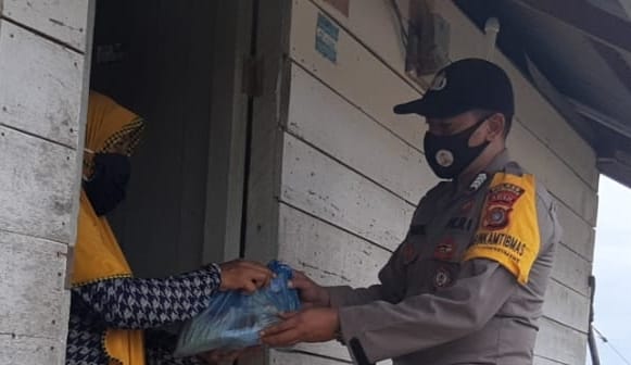 LHOKSEUMAWE - Personel Polsek Muara Batu, Polres Lhokseumawe membagikan bantuan sembilan bahan pokok (sembako) untuk warga terdampak Covid-19 di Gampong…