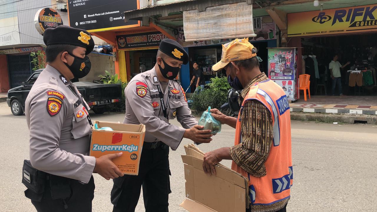 LHOKSEUMAWE - Tim Unit Reaksi Cepat (URC) Siagam Sat Sabhara Polres Lhokseumawe membagikan nasi makan siang gratis program Jum'at Barokah…